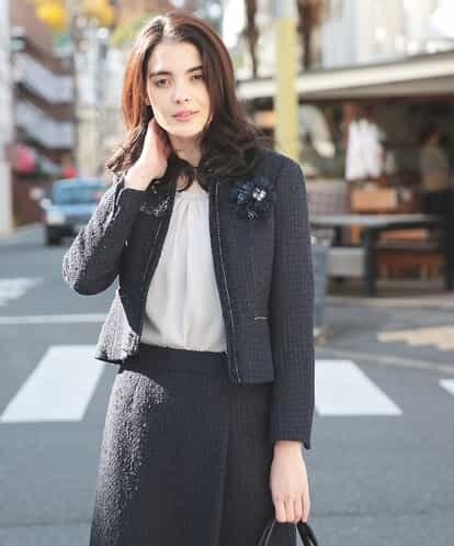 様々な素材をミックスして織り上げた、ツイード仕立てのジャケットです。ショートな丈感に、ノーカラーを合わせた上品なバランスの一着です。素材の風合いを活かしたコンパクトなシェイプに、ネックから前立てにはフリンジをあしらい、メタリックカラーのワンポイントをプラスしました。袖口に入ったスリットは、折り返してアレンジするのもオススメ。同じテキスタイルで仕立てた【EJHBG01099】と合わせて、オケージョンシーンにも最適なジャケットです。※裏地付き、コサージュは付属品ではございません。model:H158 B77 W59 H85 着用サイズ:M