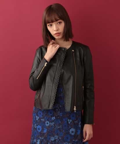 柔らかく上質な羊革を使用したライダースジャケット。前立て部分とポケットに施したスカラップディテールがフェミニンムードをプラスします。すっきりとしたノーカラーはインナートップを選ばず、ハイネックや襟付きブラウスなど幅広いスタイリングをお楽しみいただけます。コンパクトなサイズ感なので、人気のワイドパンツやハイウエストボトムと合わせても高バランスな着こなしに。※裏地付きmodel:H164 B82 W59 H88 着用サイズ:M