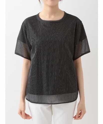 透け感のあるストライプオーガンジーの光沢が美しいレイヤードデザインになったカットソー。袖や衿ぐりのストライプの方向に変化を付けた、ハイセンスな生地使いが大人のカットソーアイテムに仕上がっています。model:H167 B80 W59 H85 着用サイズ:M