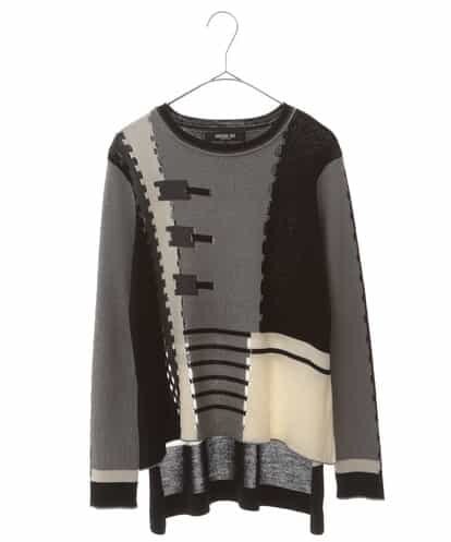 暖かく、着心地の良いメリノウールに、ソフトナイロンをカバーリング。最新のマシンで表現した、リブ編みの幾何柄ニットプルオーバー。縦に入ったアイレット、ジオメトリックにブロッキングした目を惹く配色がアクセントになった一着。前後でカラーリングを変えたコントラストのあるデザイン。腰回りまでカバーしてくれるテールロングになったヘムもポイントです。同じテキスタイルで仕立てた【RBFAH56290】もお薦めです。model:H167 B80 W59 H85 着用サイズ:M