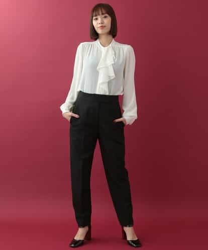 センタープレスがしっかりと入った、カッチリとした雰囲気のあるパンツです。足首にいくにつれ細くなるテーパードシルエットで、ヒップ周りにはゆとりがありキレイなシルエットながらもはき心地が良いのも嬉しいポイントです。ジャケットを合わせたスタイリングにもしっかりマッチする、オフィスシーンでも合わせて頂けるアイテムです。model:H164 B82 W59 H88 着用サイズ:M