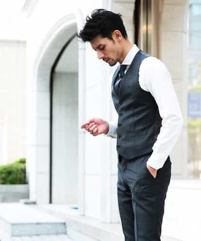 セットアップスーツ(MNNZD84120)REDAシャドーチェックと組み合わせでお楽しみいただけるジレです。 イタリアはミラノ北部に位置するビエラ地区の名門生地メーカーであるREDA社の生地を使用。 ニュージーランドには自社経営の牧場もあり、羊毛の選定から生地ができあがるまで、 徹底された管理で上質な物を作り上げている名門生地メーカーです。 美しい柄と高級感のある風合いをお楽しみ下さい。 ※本商品(MNVJD84350 )は単品でもお使いいただけるジレです。 スーツ(MNNZD84120)は別売りとなっております。 進化したミッシェルクランオムのスーツをぜひ体感してみて下さい。