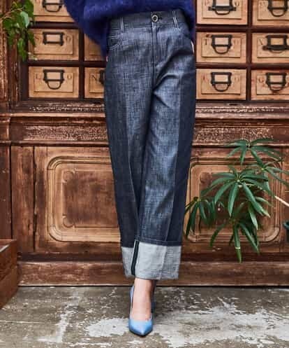 トレンドのワイドパンツ。上質なコットンデニムを使用した大人の贅沢を感じさせる一本です。センタープレスを施すことで縦のラインが強調され、すらっとした足長効果が期待できます。ウエスト周りもすっきりとして、メリハリのある女性らしいシルエットに。デニムに馴染むブルーを採用したステッチや大きく折り返した裾などこだわりのディテールが光るパンツです。