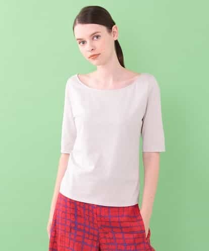シンプルでベーシックなコットン素材のハーフスリーブカットソー。大きく開いたラウンドカットがデコルテラインをキレイに女性らしく演出します。しっとりとした気持ちの良い肌触りでジャケットやカーディガンのインナーとしても最適で、ロングシーズンお使い頂けるアイテムです。model:H170 B80 W58 H81 着用サイズ:M