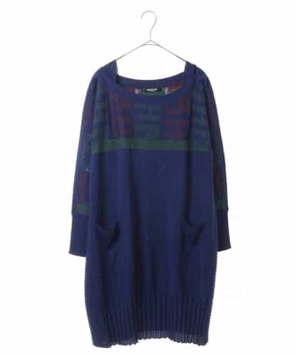 「HIROKO BIS」の頭文字、HとBの頭文字をカラフルに施したデザインニットワンピース。今年トレンドのロゴをデコルテラインに入れているのでバスト部分から袖にかけて、上半身に目線が上に上がり、スタイルアップも叶うアイテムです。サイドやヘムに入ったリブデザインが縦のラインを強調し、きれいなIラインを表現してくれます。一枚で十分な存在感のあるスタイリングにまとめてくれるチュニックです