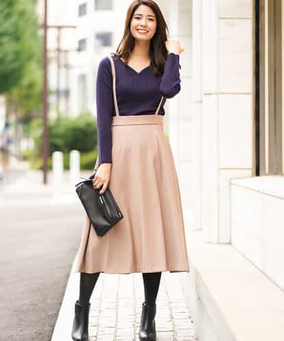 ウエスト周りがスッキリとしたシルエットで、揺れる裾が足さばきをキレイにみせてくれます。 大人が上品に可愛く履けるサス付きフレアースカートです。 パンプスもブーツも合わせやすいミモレ丈。