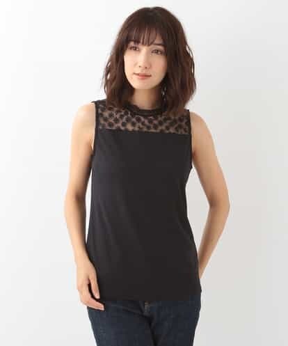 胸元にレース切り替えのある、ノースリーブブラウスです。フラワーモチーフの可愛らしい刺繍にスカラップのスタンドカラーが顔周りを華やかに演出してくれます。丸みのあるバックボタンもさりげないアクセントに。柔らかく着心地の良いジャージー部分もポイントです。レースを活かしたレイヤーコーディネートもおすすめ。model:H167 B80 W59 H84 着用サイズ:M