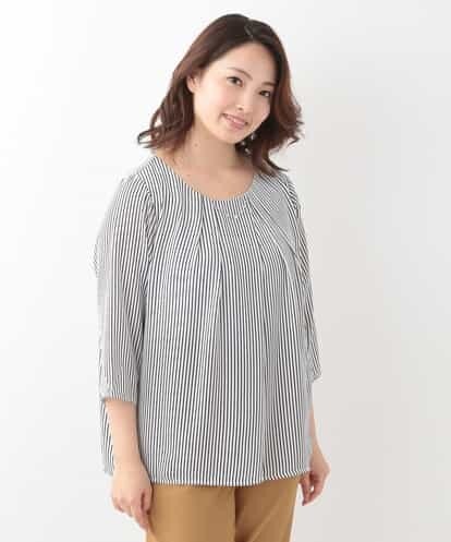 爽やかなストライプ柄が目を惹く、プルオーバータイプのブラウスです。ネックラインに施したタックが美しいドレープを演出してくれ、ストライプ柄をさらに引き立ててくれる一着になっています。フロントネックには取り外しの出来るフェイクパールのアクセサリーがエレガントなアクセントに。身頃は着心地の良いジャージー素材で裏地が付いているのも嬉しいポイントです。