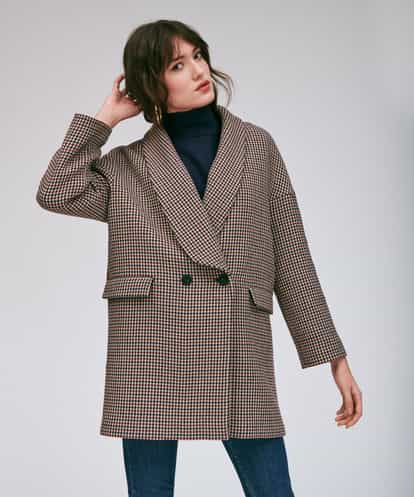 コットンやウールなど、様々な素材をミックスした、表情豊かなテキスタイルで仕立てたコート。織り地で表現したカラーが目を惹く千鳥格子柄が、モダンな印象の一着です。大きなショールカラーやドロップショルダーにコクーンシルエットがフェミニンさのある存在感を放つアウターです。※裏地付き model:H170 B81 W59 H88 着用サイズ:M