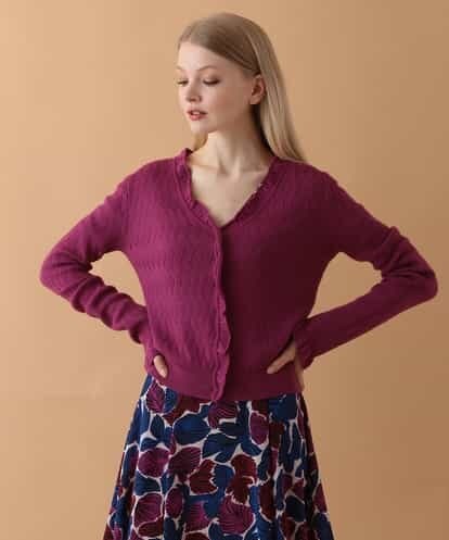 柔らかな糸で編み立てた、優しい肌触りが心地良いニットカーディガンです。 広めに開いたVネックがデコルテを美しくフェミニンに照らす一着です。 英繰りから前立てと、袖口には度違い天竺編みのフリルを配してキュートな印象を高めます。 着丈は短く、袖丈が長めで上半身を華奢に見せてくれます。 上品な風合いがスタイリングを女性らしさを引き立ててくれるアイテムに仕上がっています。 model:H170 B81 W59 H88 着用サイズ:S