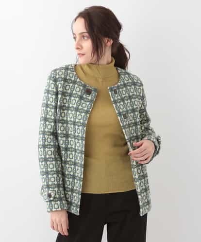 ウールに様々な素材をミックスして織り上げた、表情豊かなテキスタイルで仕立てたジャケットです。レトロモダンな風合いを魅せてくれる特徴的な織柄に、大きなデザインボタンがアクセントになった一着です。ノーカラーに、フロントは隠しボタンですっきりと仕上げ上品なバランスでまとめました。※裏地付きmodel:H165 B79 W60 H88 着用サイズ:M