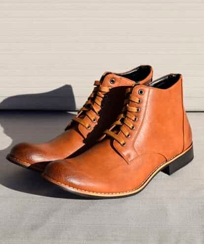 どんなスタイルにも合わせやすい定番デザインのレースアップショートブーツ。味のあるフェイクレザーを使用し、使い込む程に馴染む履き心地が嬉しいアイテムです。サイドジップを施し、着脱も楽ちん。ビジネス着からカジュアル着まで幅広く合わせるのにオススメです。